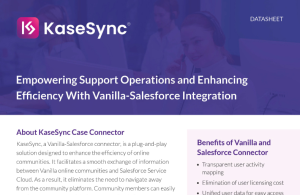 KaseSync is a powerful integration tool that connects Higher Logic Vanilla communities with Salesforce, enabling smooth data flow between the two platforms. By syncing case-related information in real-time, the connector simplifies case management, accelerates case resolution, and enhances the overall customer experience, which drives improved customer engagement. Furthermore, by leveraging KaseSync, organizations can drive operational efficiencies, leading to better business outcomes.